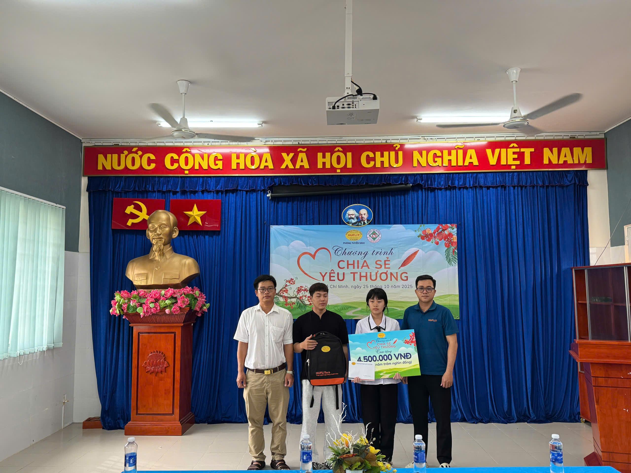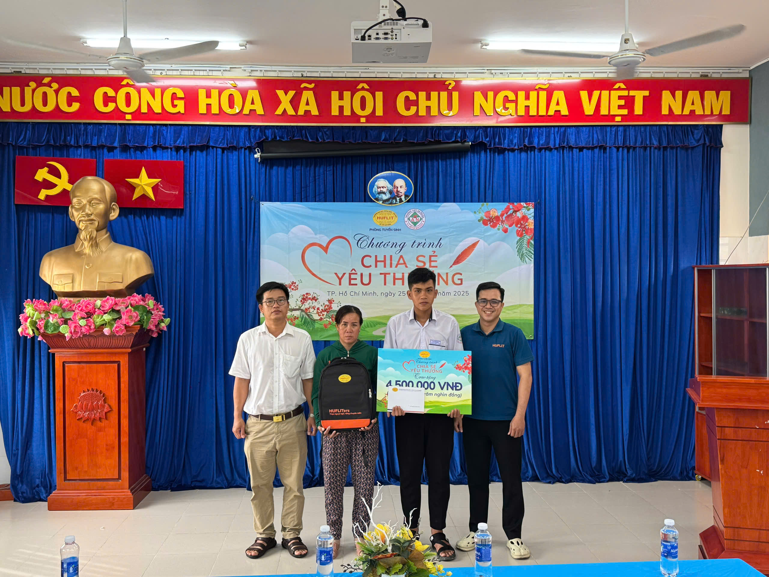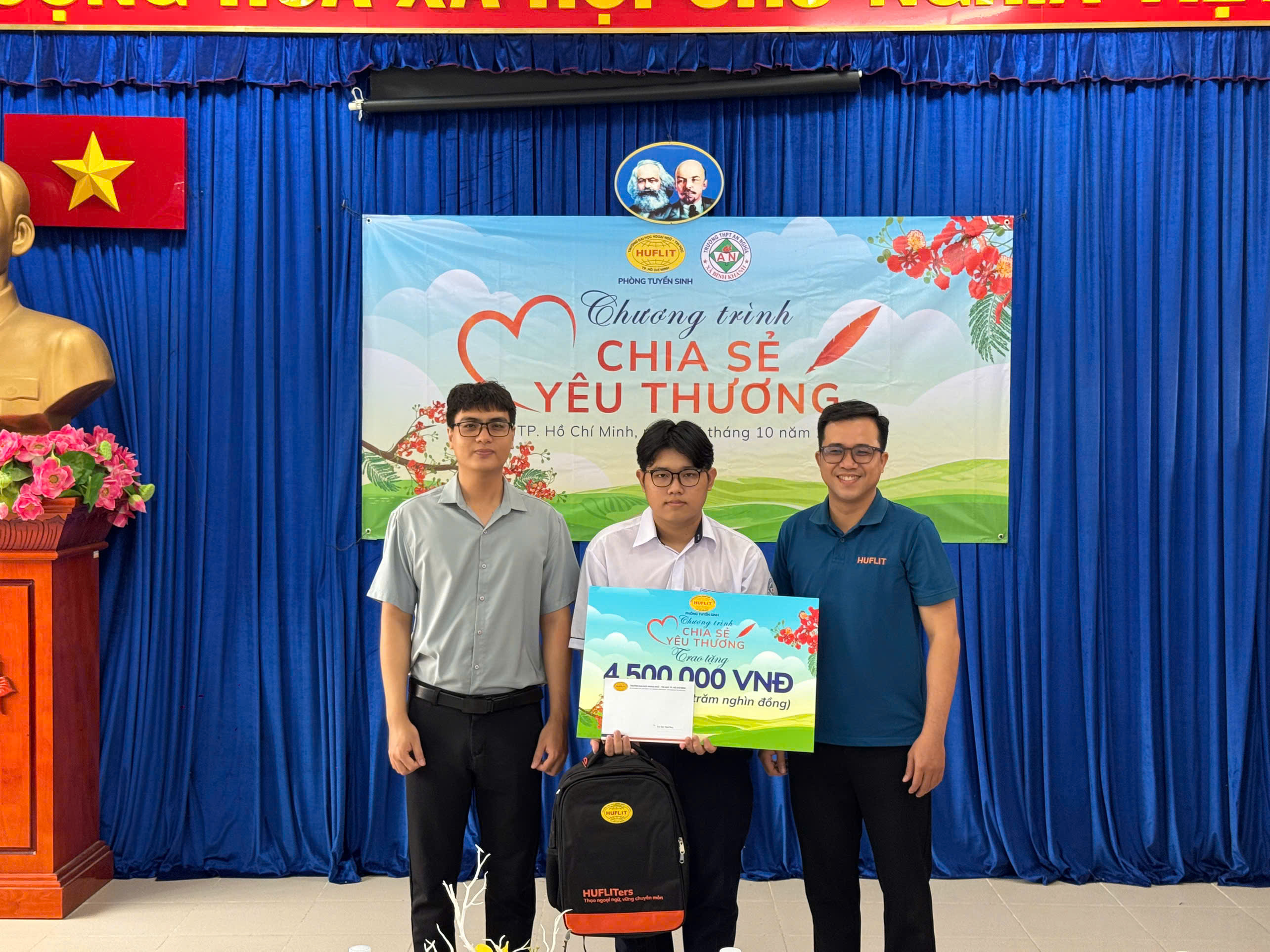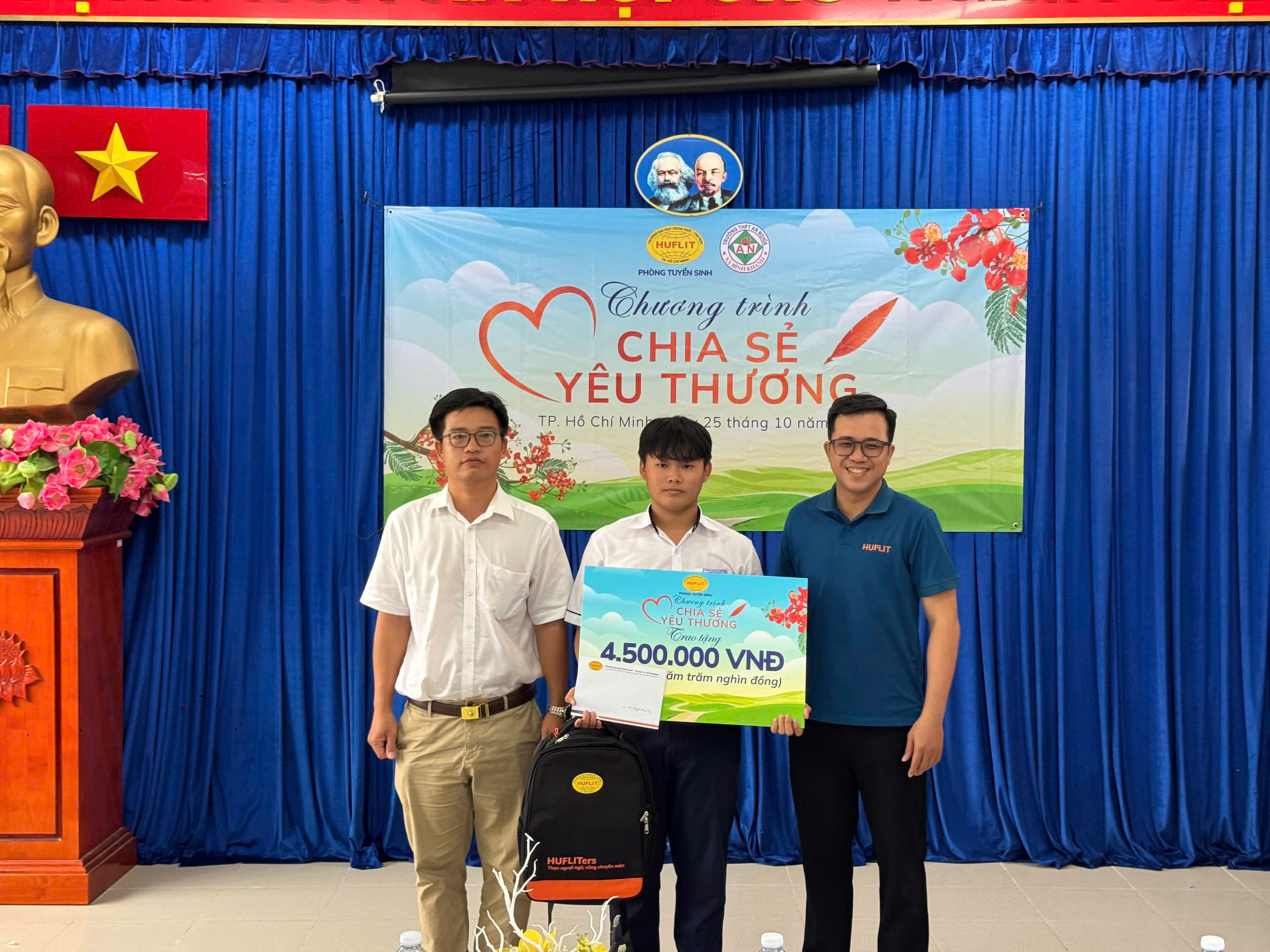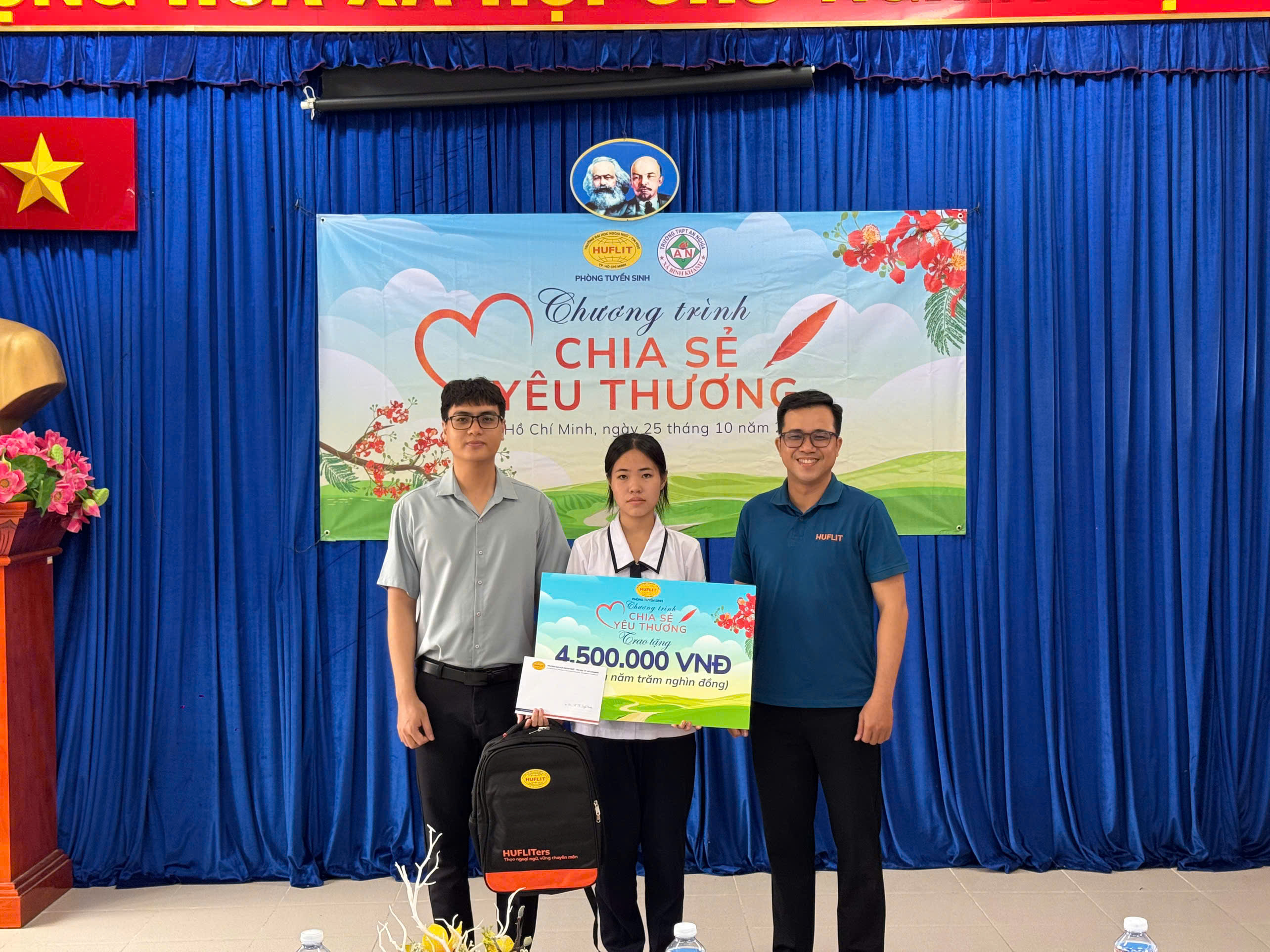 At the ceremony, Mr. Chung Quoc Phong, Head of the Admissions Office Trade Union, represented HUFLIT in presenting scholarships to five students. The award ceremony took place in a warm and heartfelt atmosphere, reflecting empathy and genuine care from the HUFLIT community, motivating the students to continue striving in their studies.