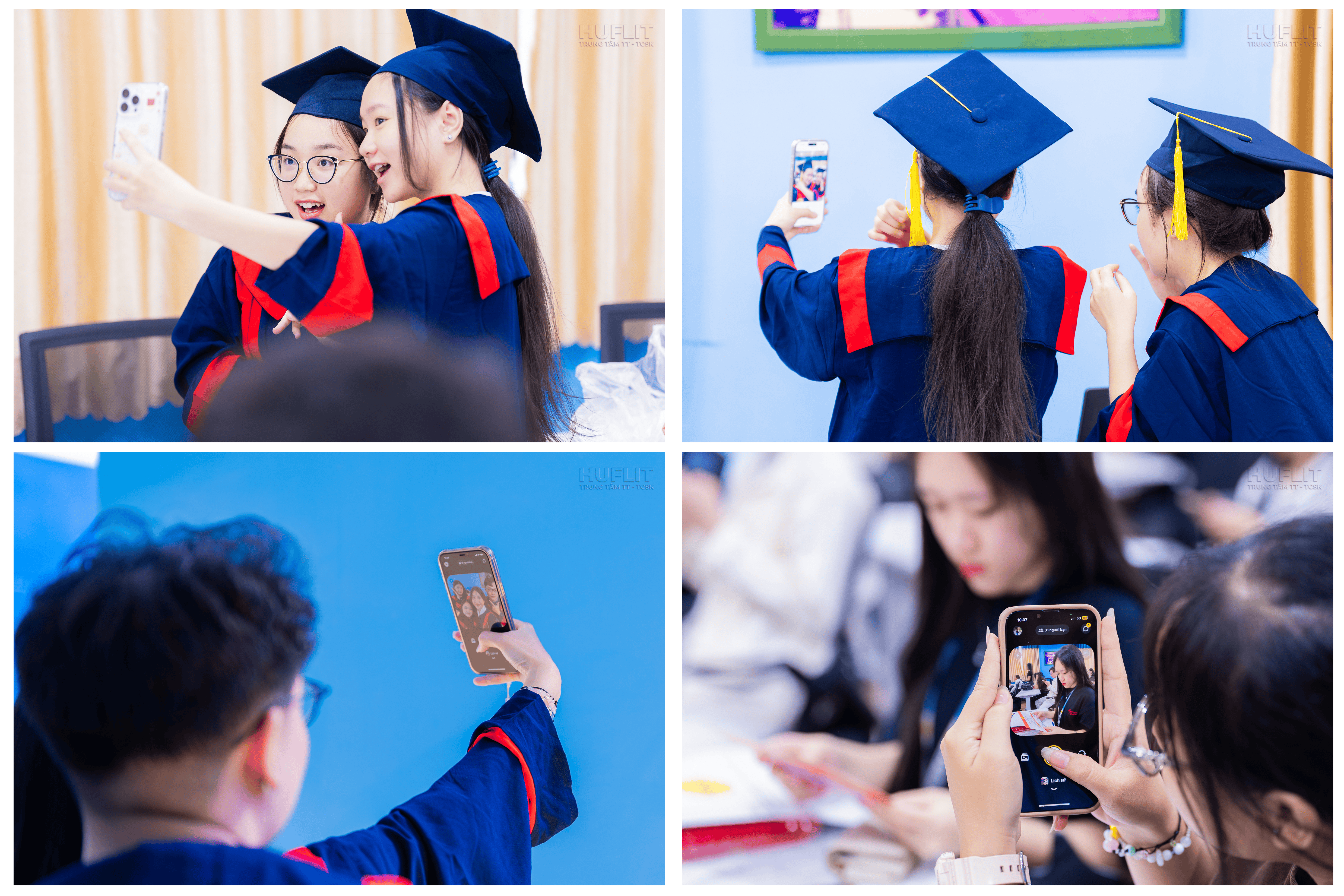 Niềm vui ngày nhận lễ phục càng trọn vẹn hơn khi được sẻ chia cùng những người bạn đã đồng hành suốt những năm tháng đại học. Quãng thời gian ấy không chỉ gói gọn trong sách vở và giảng đường – mà còn là những đêm cùng nhau chạy kịp hạn nộp bài, những buổi làm đề tài đến kiệt sức, hay những phút hồi hộp trước mỗi kỳ thi.