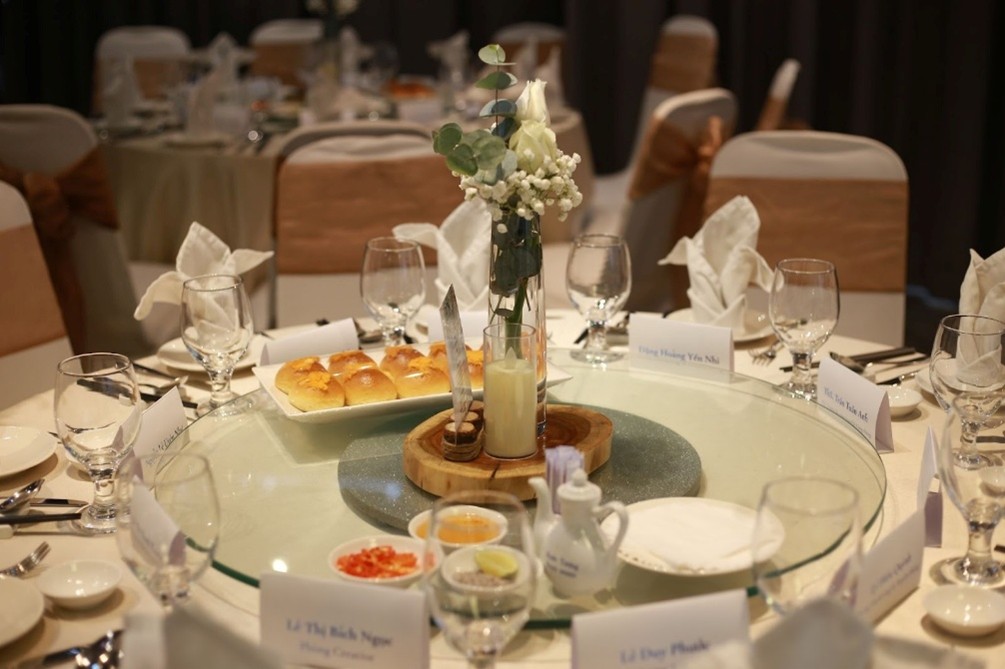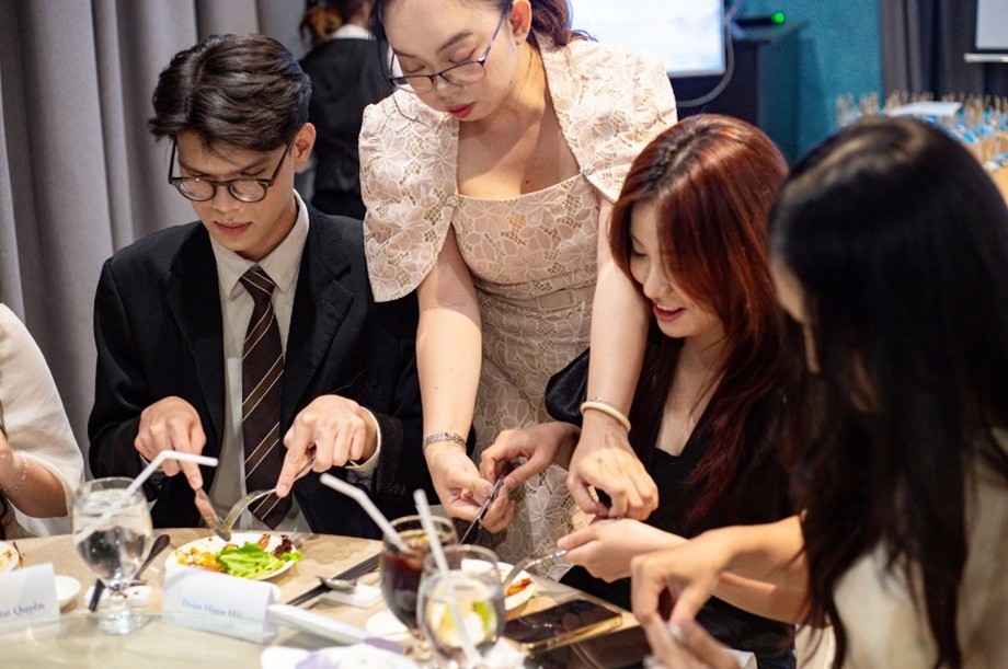Dưới sự hướng dẫn của ThS. Trương Thị Lê Hồng, các bạn sinh viên đã trực tiếp thực hành các kỹ năng chuyên môn như đón tiếp khách, trao danh thiếp, sắp xếp chỗ ngồi, cũng như quy tắc sử dụng bộ dụng cụ bàn tiệc. Buổi học tái hiện đầy đủ bối cảnh của một sự kiện doanh nghiệp, tạo điều kiện để sinh viên quan sát, thực hành và nhận phản hồi trực tiếp từ giảng viên.