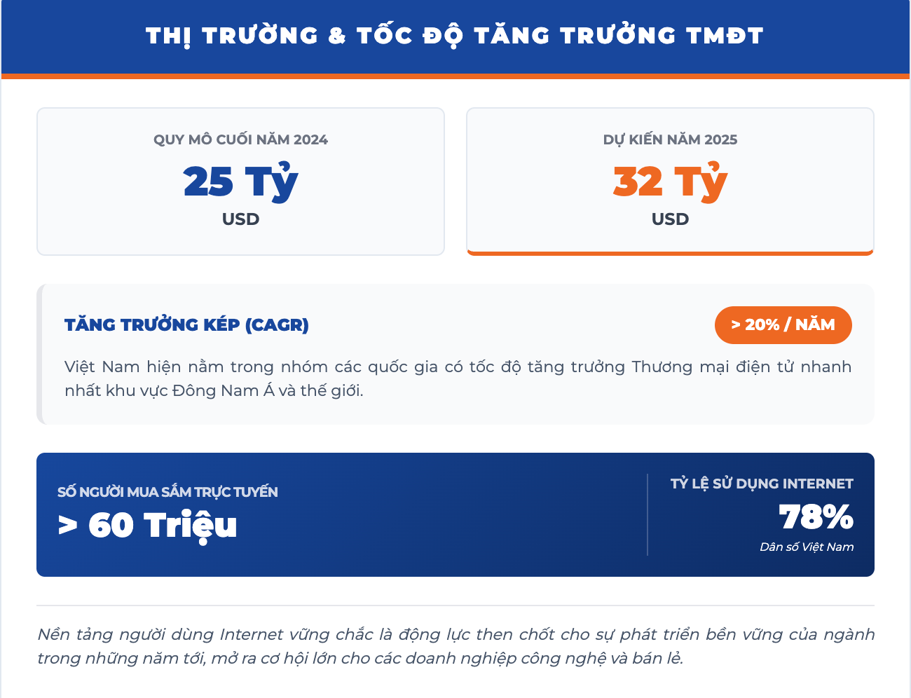 Số lượng người dùng Internet tại Việt Nam đã vượt 78% dân số, trong đó có hơn 60 triệu người tham gia mua sắm trực tuyến. Đây là nền tảng vững chắc cho sự phát triển bền vững của ngành trong những năm tới.