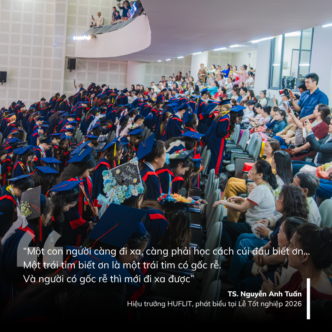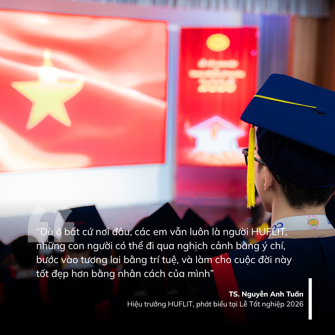 Hôm nay là ngày chúc mừng, nhưng cũng là ngày bắt đầu. Một chương sách khép lại để một chân trời khác mở ra. Từ hôm nay, các em không chỉ mang theo một tấm bằng, mà còn mang theo danh dự của một người tốt nghiệp từ HUFLIT, niềm tin của gia đình, kỳ vọng của thầy cô, và trách nhiệm đối với cuộc đời mà các em sẽ tự tay viết tiếp.