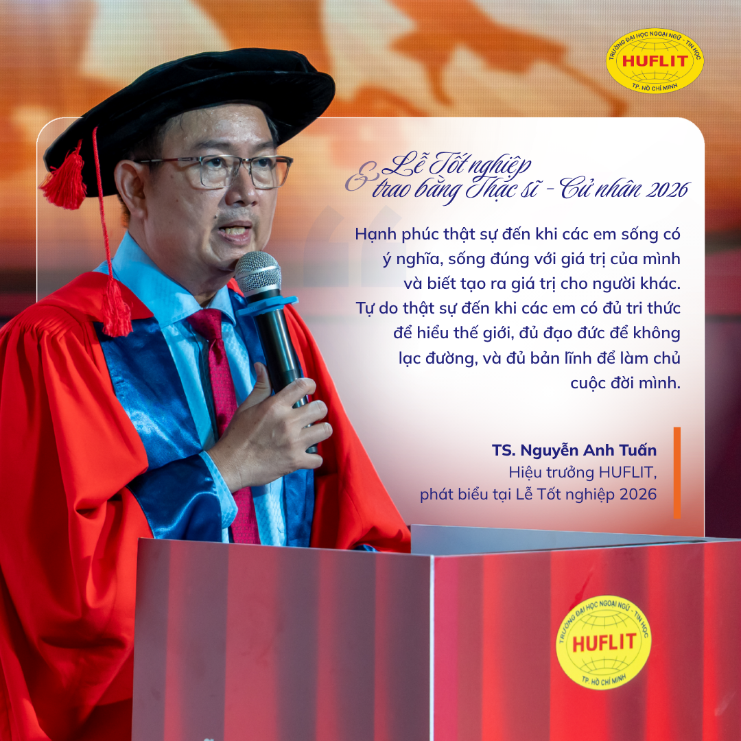 Ở HUFLIT, chúng tôi luôn tin vào một triết lý giản dị nhưng sâu sắc: mưu cầu hạnh phúc và tự do dựa trên nền tảng đạo đức và trí tuệ. Hôm nay, thầy muốn gửi triết lý ấy như một món quà tốt nghiệp dành cho các em. Hạnh phúc không đến từ may mắn nhất thời. Tự do cũng không phải là muốn làm gì thì làm. Hạnh phúc thật sự đến khi các em sống có ý nghĩa, sống đúng với giá trị của mình và biết tạo ra giá trị cho người khác. Tự do thật sự đến khi các em có đủ tri thức để hiểu thế giới, đủ đạo đức để không lạc đường, và đủ bản lĩnh để làm chủ cuộc đời mình.